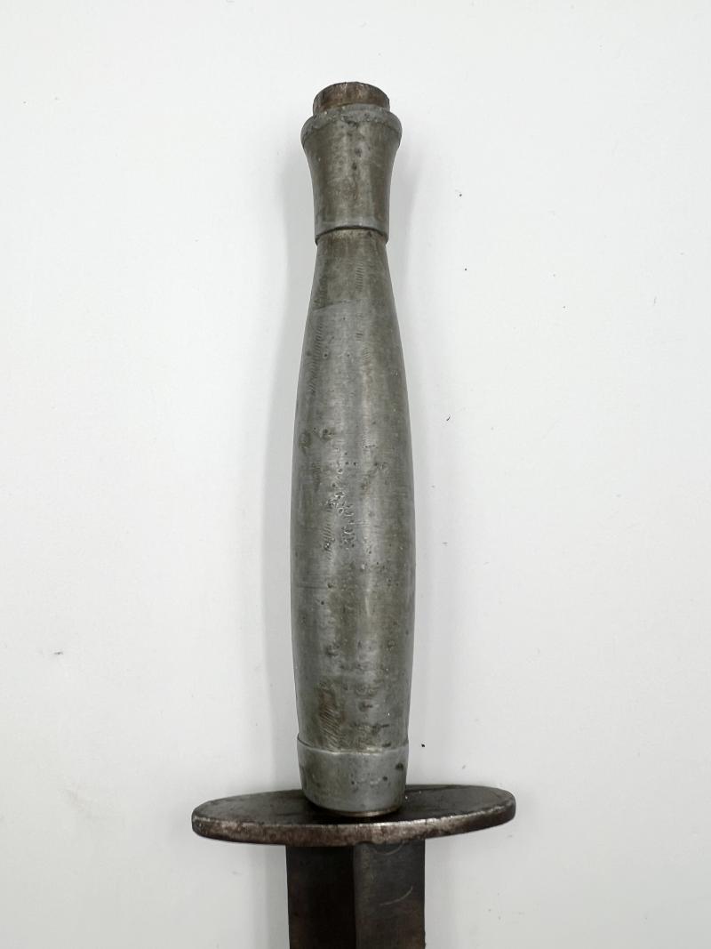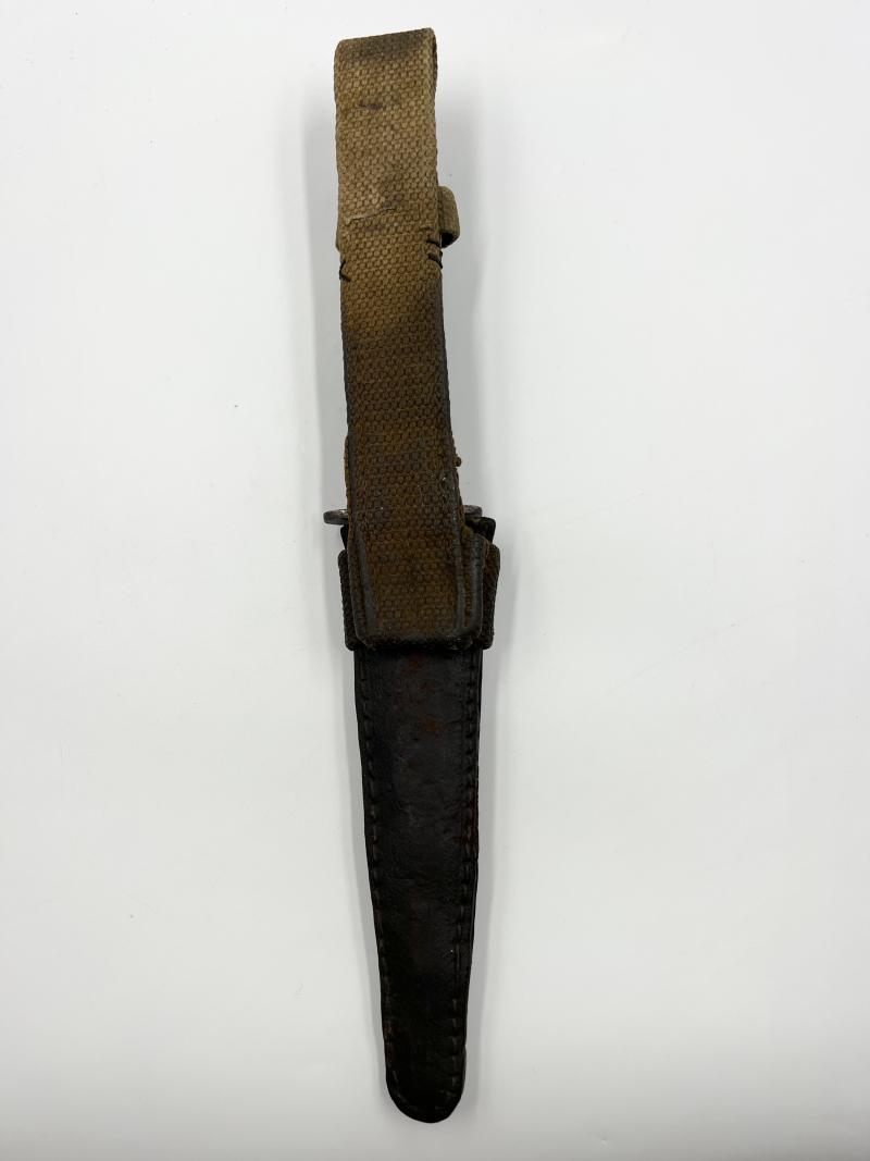 So called Polish issue smooth handled variant. One of these examples was found a number of years ago with a lot of items belonging to a Poland Army In Exile soldier. Although this example differs slightly in that not the entire grip is completely smooth, identical examples to this have been found with wartime attribution. It started life as a standard 3rd pattern knife. Modified leather sheath incorporating 1937 pattern frog. This example is well used and has seen a service life, the blade measuring 15.5cm.