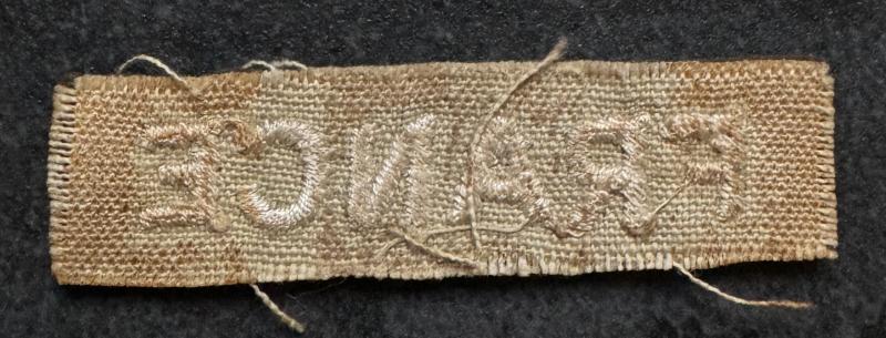 Scarce straight cloth shoulder title. White embroidered letters on khaki.