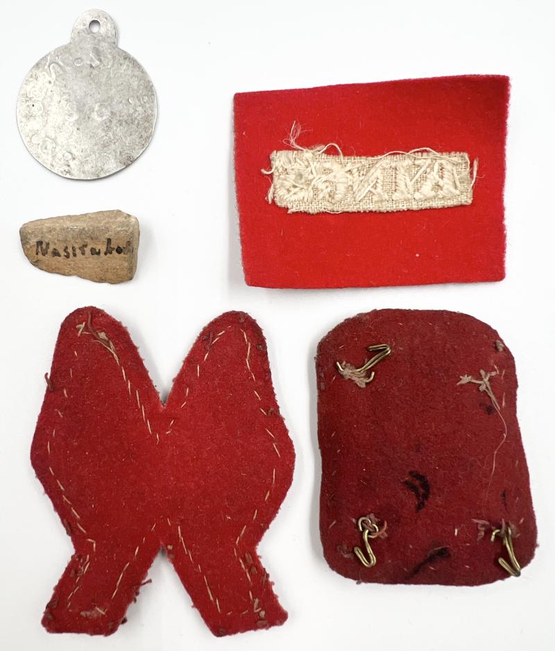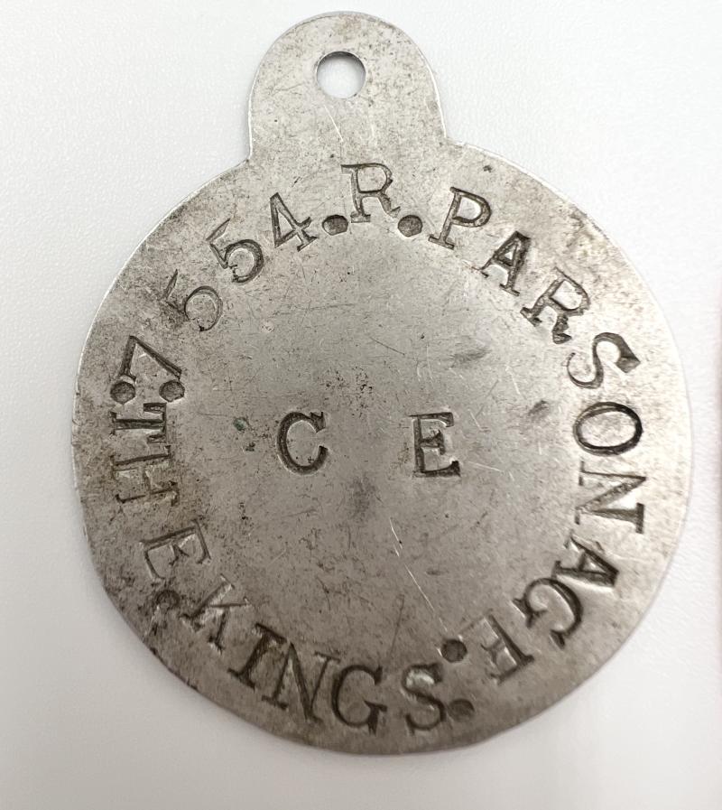 Early pattern dog tag to 7554 R. Parsonage The Kings, cloth pagri flash, crossed flags signaller badge, drummers badge and small piece of stone marked "kings memento". All items found together.