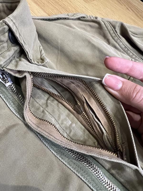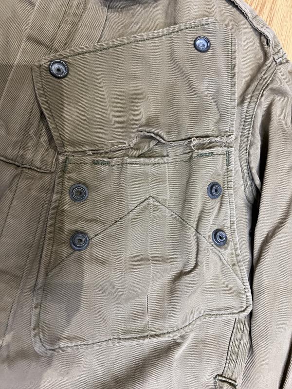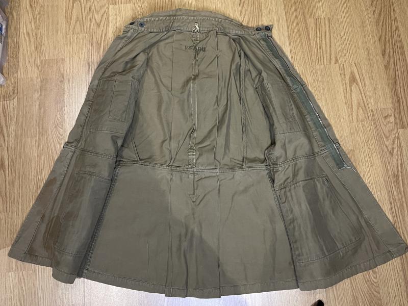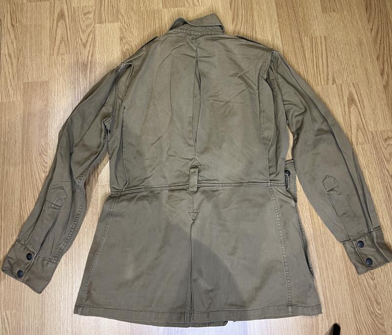 A good basic unreinforced M42 jump jacket as used in the Normandy campaign by US paratroopers. All poppers and zips present, washed out label, laundry number to inside of back, belt absent.