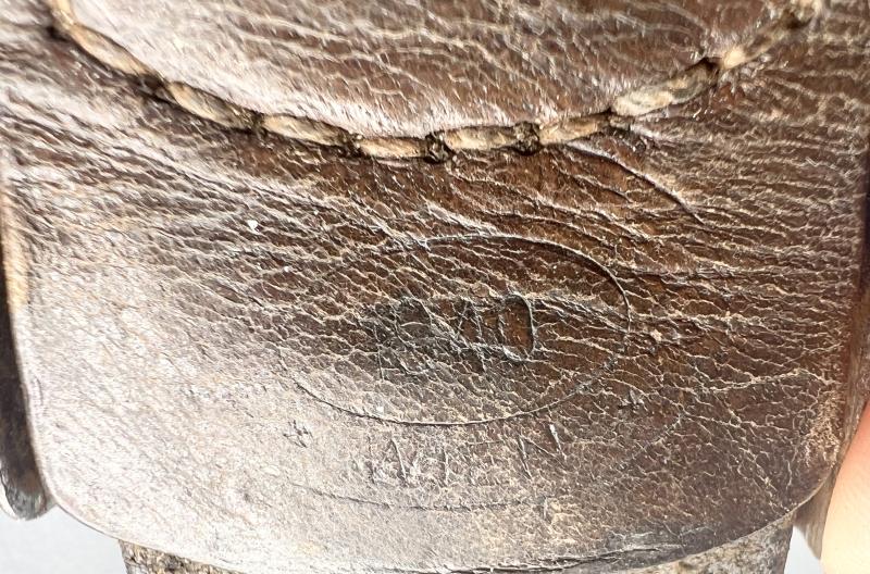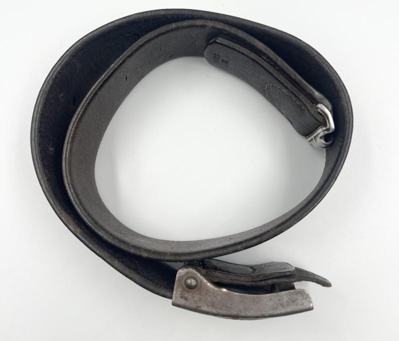 Combat used belt buckle with tab and belt combination. Both parts original to each other. No visible markings on buckle, tab dated 1940 and belt length very small 26 inches. Very small self made adjustment holes on this example.