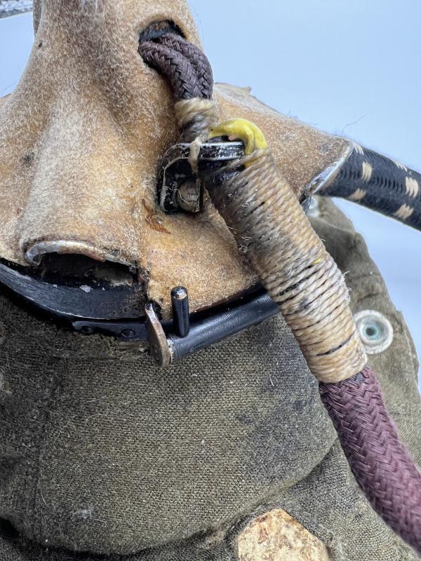 Mask is in good complete order with stains, wear and some minor moth damage. The outside made of barathea wool, inside lined with chamois leather and the microphone covered with chamois leather. Connector ring marked 6D/117. Press studs all present and working but oxidised.