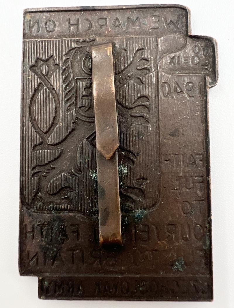 Scarce commemorative badge with the coat of arms of Czechoslovakia and the inscription 'WE MARCH ON' '28 IX1940' 'FAITHFUL TO OURSELVES FAITHFUL TO BRITAIN'. Two blades to back