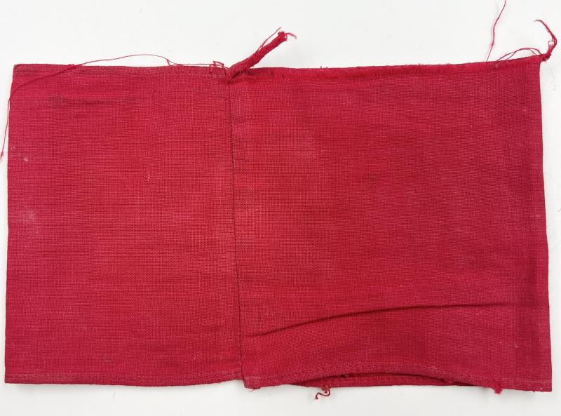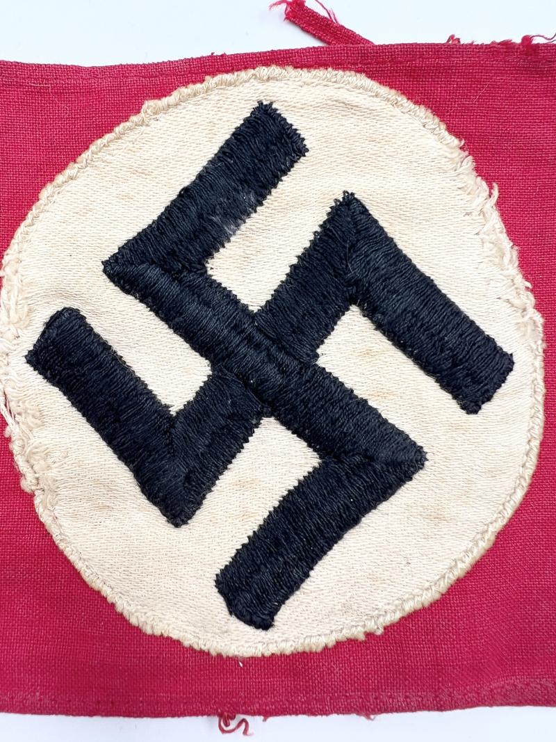 Embroidered black Swastika on white circle. White circle is stitched onto red arm band. Some distortion to Swastika.