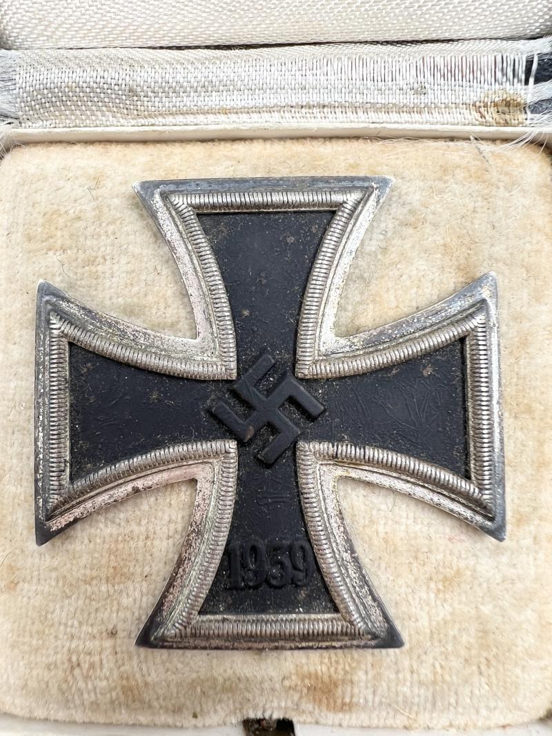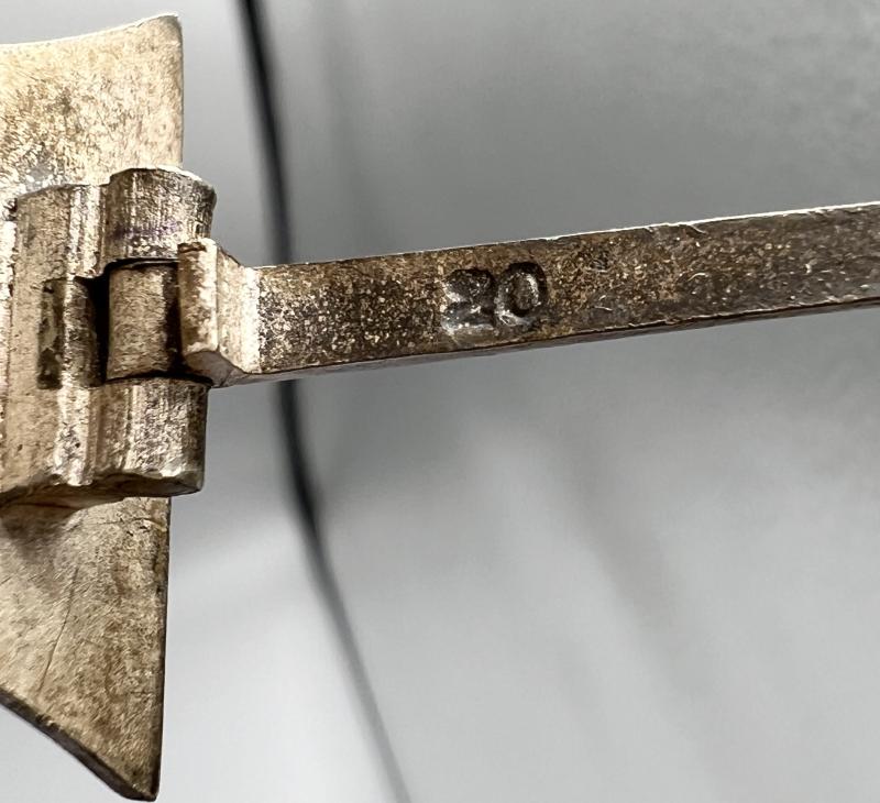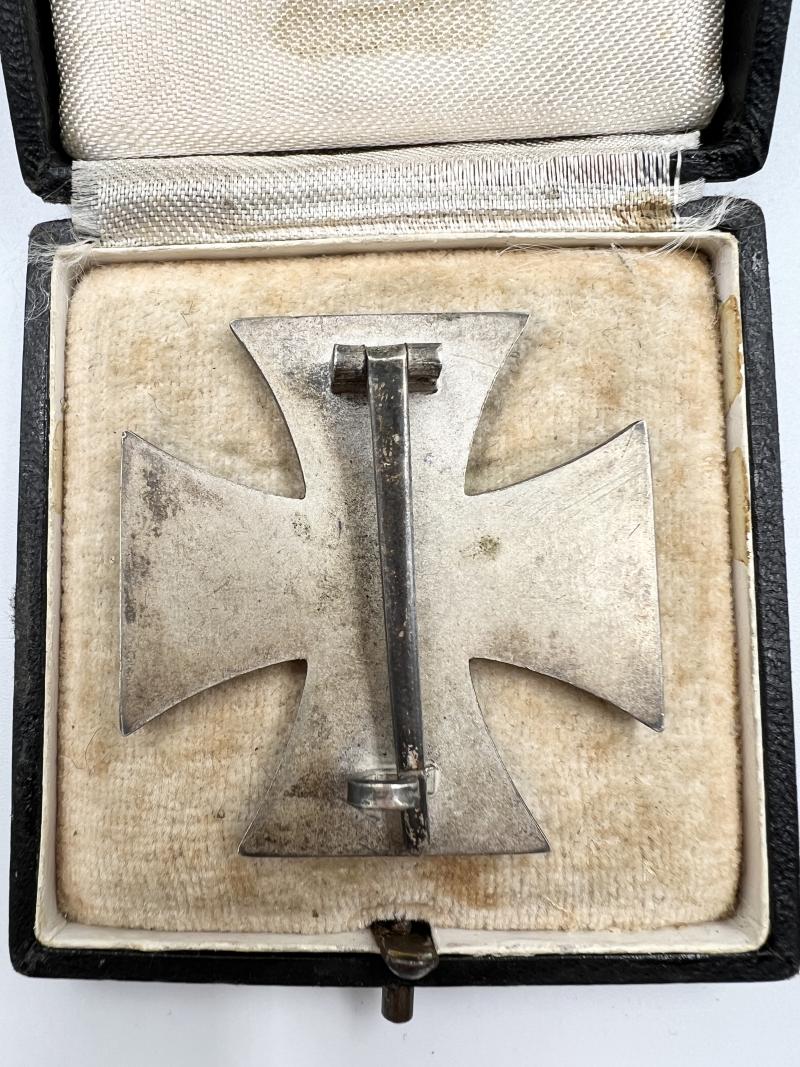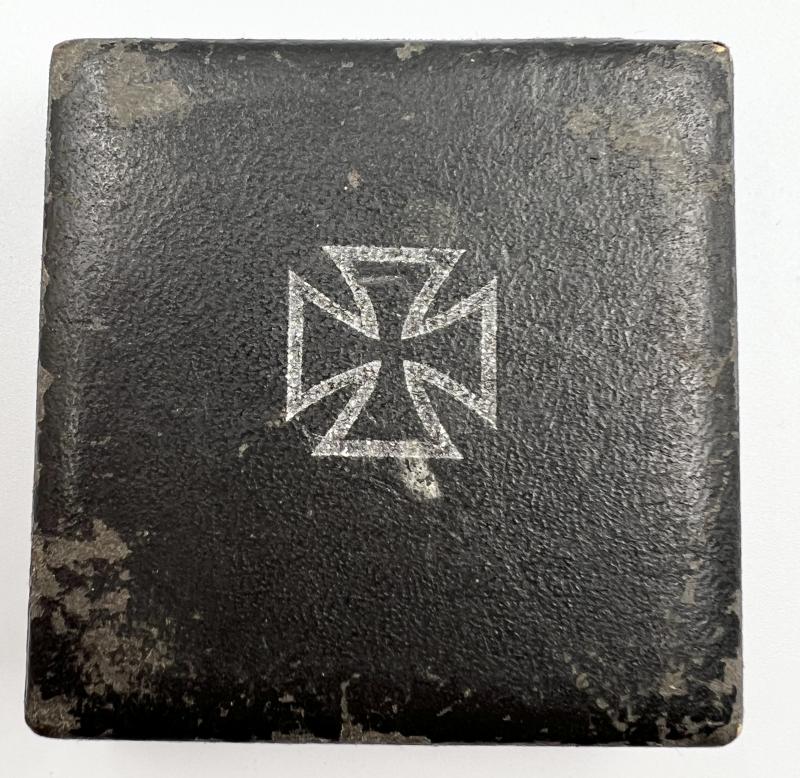 20 marked for C.F. Zimmermann. Three piece construction. Very good complete undamaged example showing lovely patina. Box is worn and interior card of lid has become loose. As far as I can tell the cross and the box are original to each other.