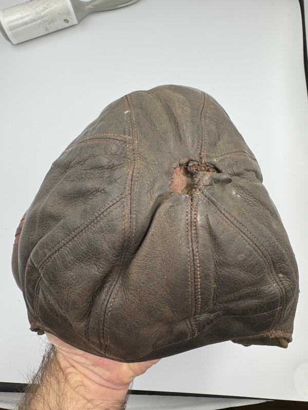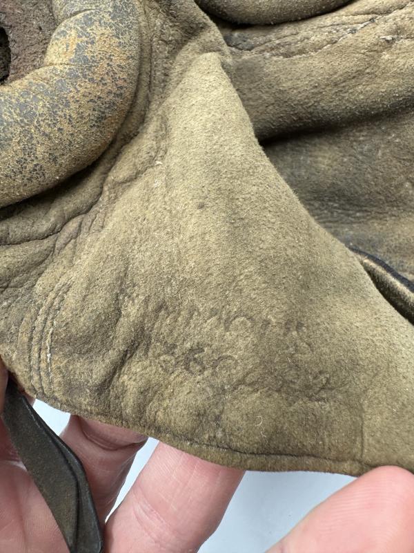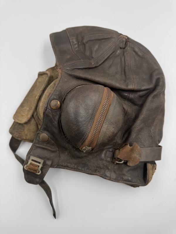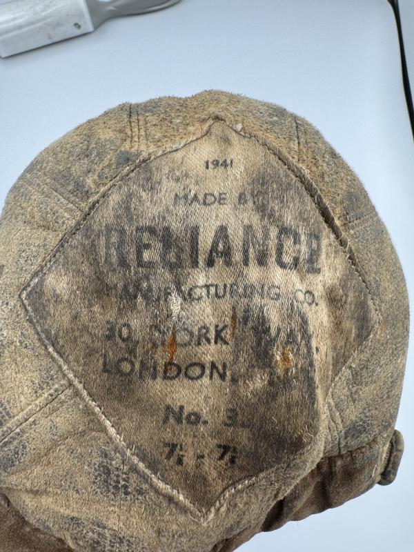 Lovely used example made by Reliance and 1941 dated. Size No 3. Good complete condition albeit dirty from use, save for small hole in top of helmet where seams meet and leather pull tabs on ear zips absent. Named inside Simmons with a service number, which is difficult to read.