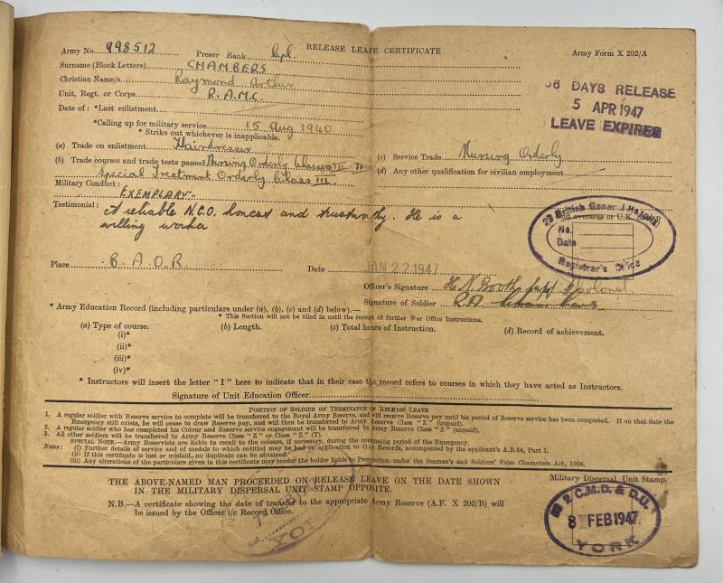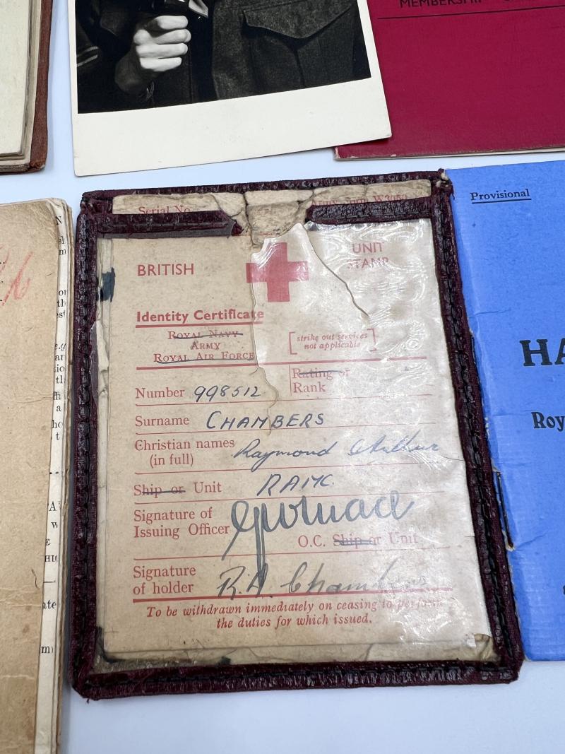 A superb, complete group of items formerly the property of 998512 Corporal Raymond Arthur Chambers. Although unresearched Mr Chambers served with the RAMC and was present on D-Day as part of Operation Overlord. Included are the following.