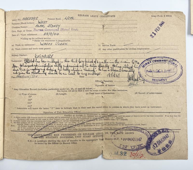 A nice lot of unresearched items to 14852392 Lance Corporal Alan Sydney West of the Burma Command Signal Regiment. His parent unit was the Sherwood Foresters and Border Regiment. It looks like he was attached to the Burma Command Signal Regiment. Items include:
