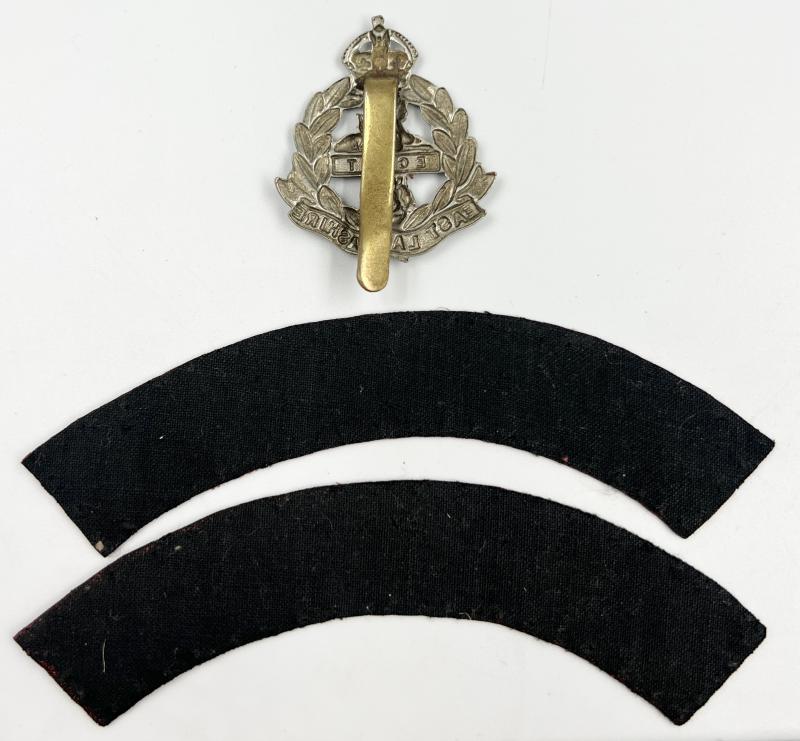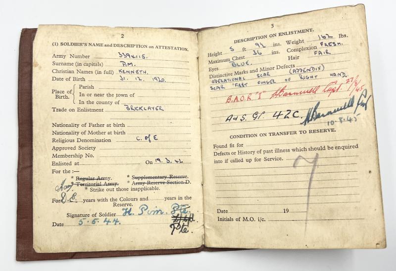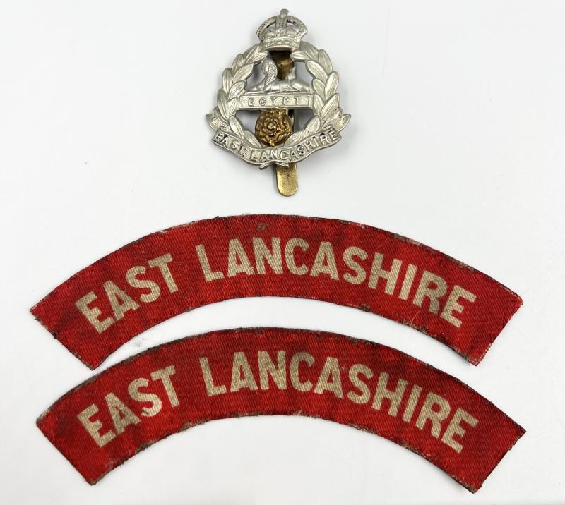 Lot of items belonging to 3394115 Private K Pim of the East Lancs. Group consists of: - AB64 - Record of service card - Printed shoulder titles - Bi metal cap badge