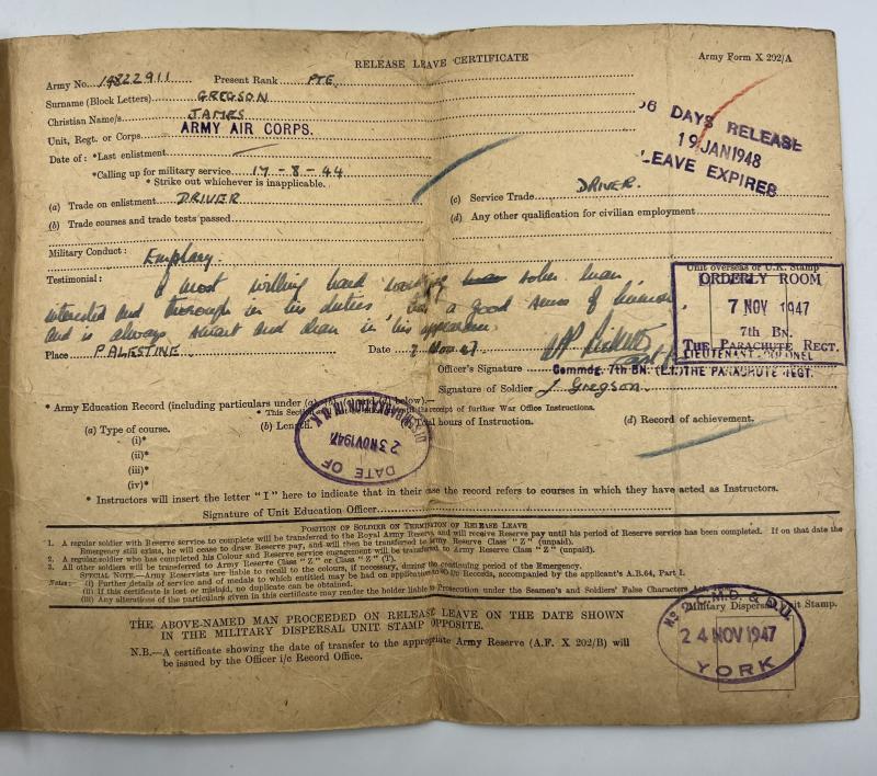 Large selection of items, formerly the property of 14822911 Private J Gregson. He signed up in mid 1944 with the East Lancs Regiment and transferred to 7 Para for the remainder of the war in the Far East. Unresearched. Items included: