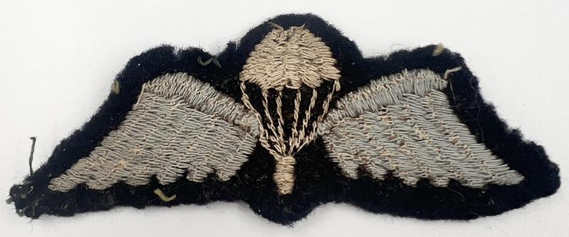 Very rare British made wing. Black backing, blue wings (now faded), and white parachute. This pattern of wing is most commonly associated with 156th Battalion Parachute Regiment, No 2 Commando and Special Operations Executive. Most surviving examples are in unused condition, however this example has been removed from uniform, no doubt being service used.
