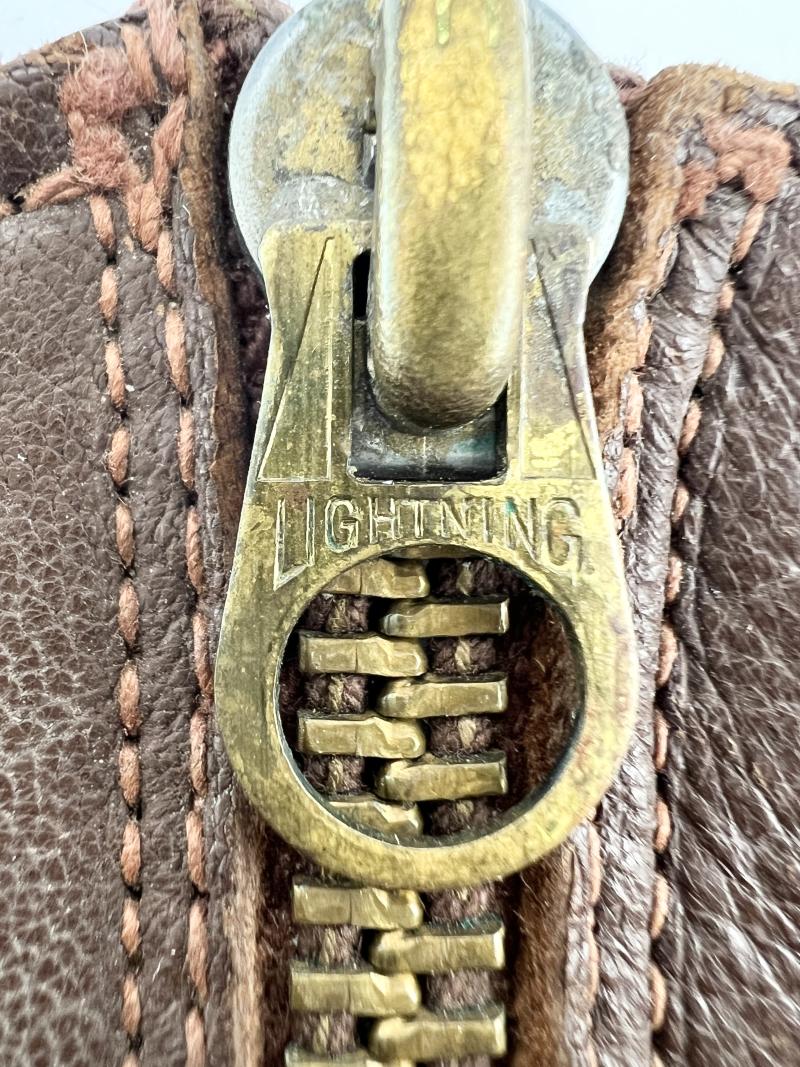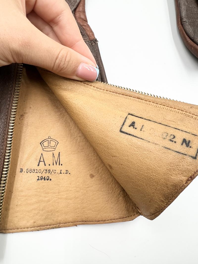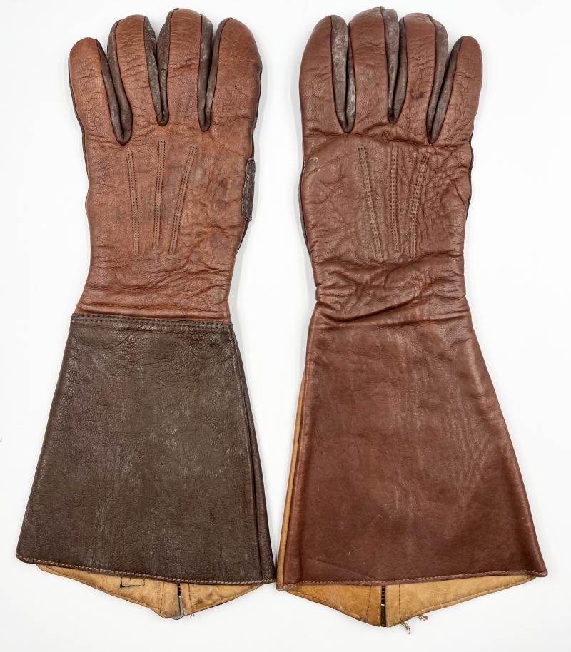 Perfect matching pair of brown leather flying gloves, worn together. The leather is supple and undamaged. The colour match is very interesting in that a combination of light and darker leather has been used making a very attractive pair of gloves. Original brass Lightning zips minus their leather pull tabs. Air Ministry Kings Crown and AID stamps and 1940 dates.