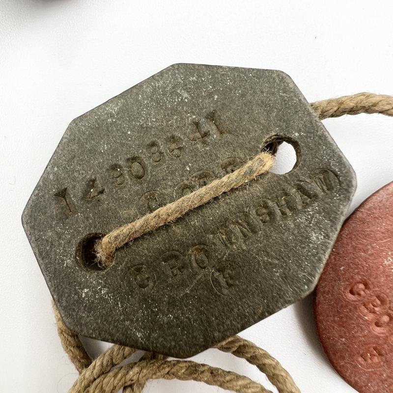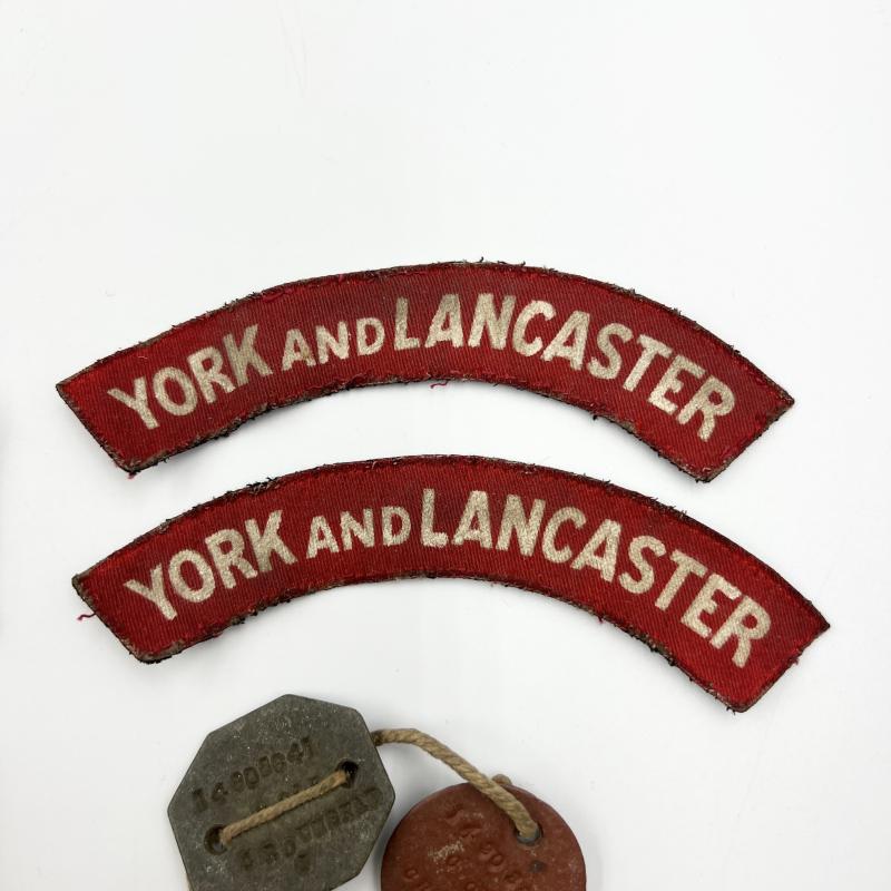 Lot of items all came together with former owners details on dog tags. Lot consists of: - Printed shoulder titles - Corporals stripes - Single red slip on - Dog tags 14908841 Crownshaw F