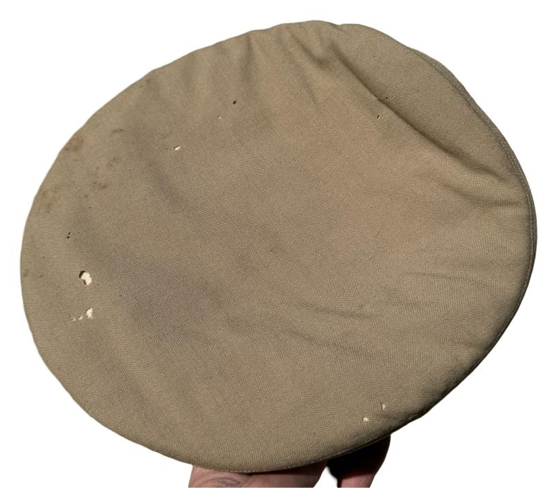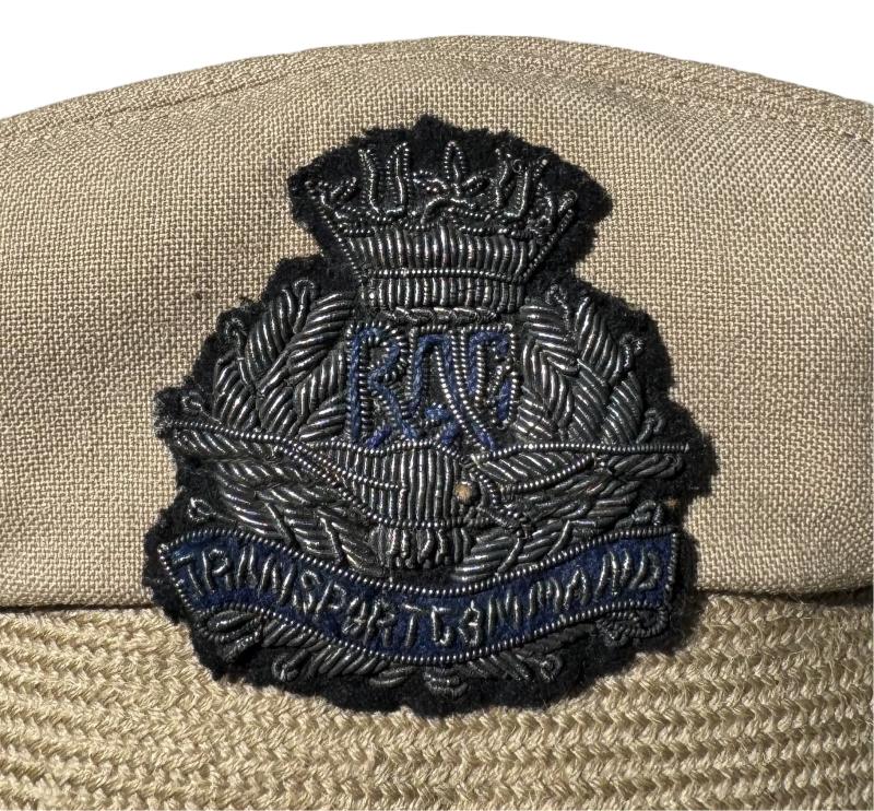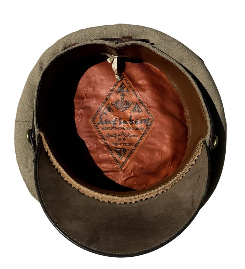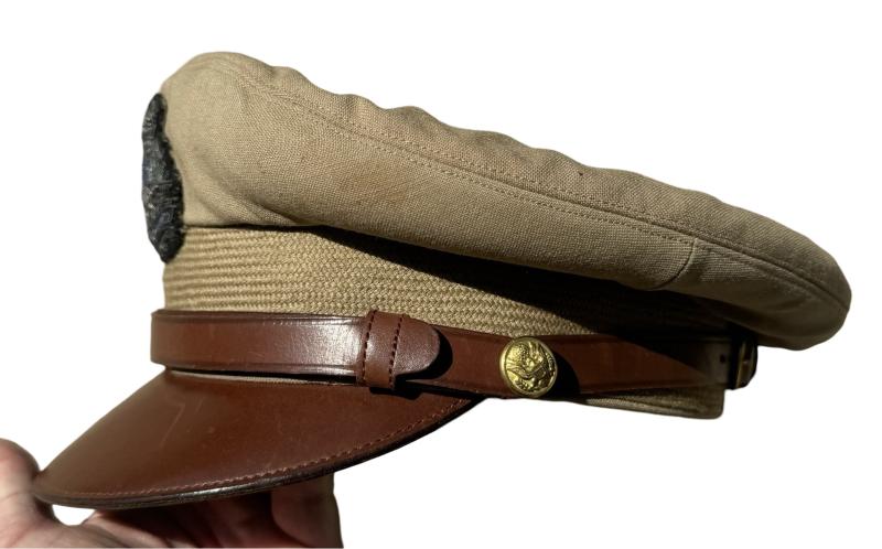 An interesting item dating from the immediate post war period (we know this by the style of label in the cap), a United States summer peaked cap with a hard to find RAF Transport Command bullion cloth cap badge to front. Cap shows use and has several moth holes to top. Perhaps this is a Berlin Airlift related piece as a number of US Officers served with RAF Transport Command during this period.