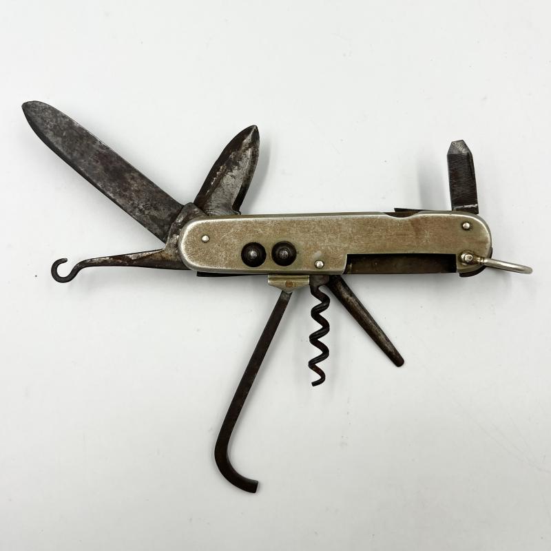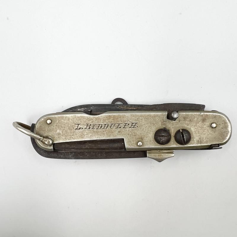 John Watts of Sheffield made. Contemporary engraved name of owner L Biddulph. A good used example which requires cleaning and some TLC. One small blade is broken, no other damage elsewhere.