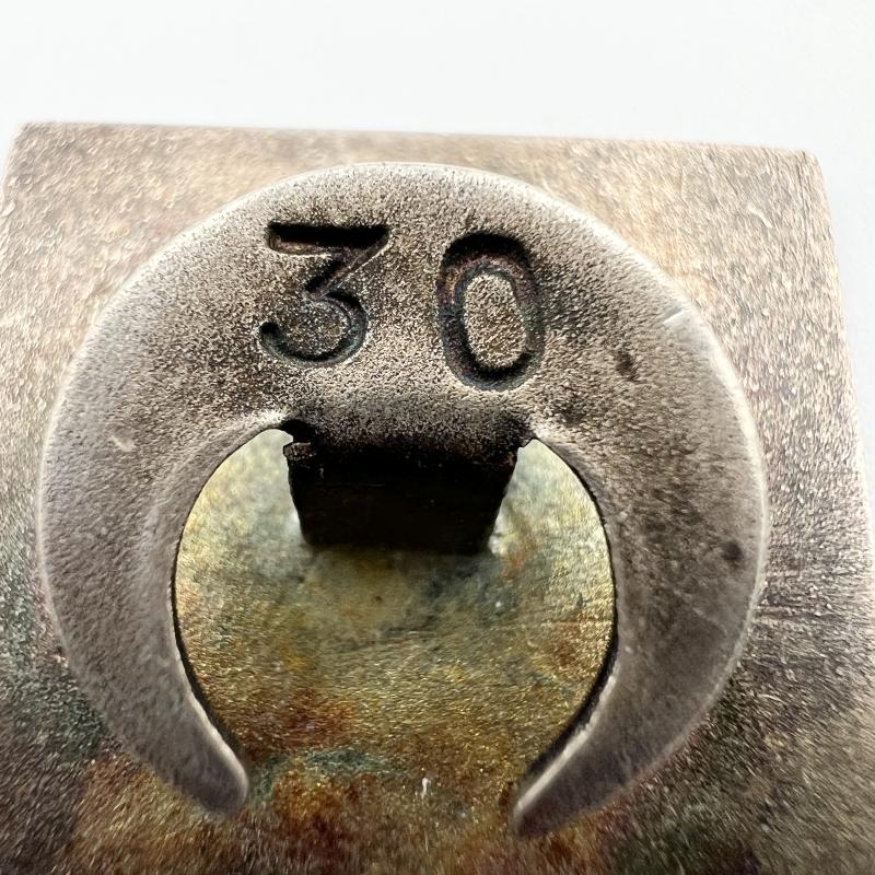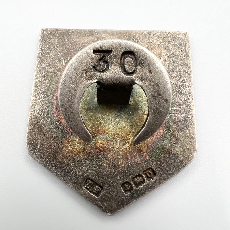 Unusual silver & enamel lapel badge. Numbered 30 to the back. Silver hallmarked for 1944.