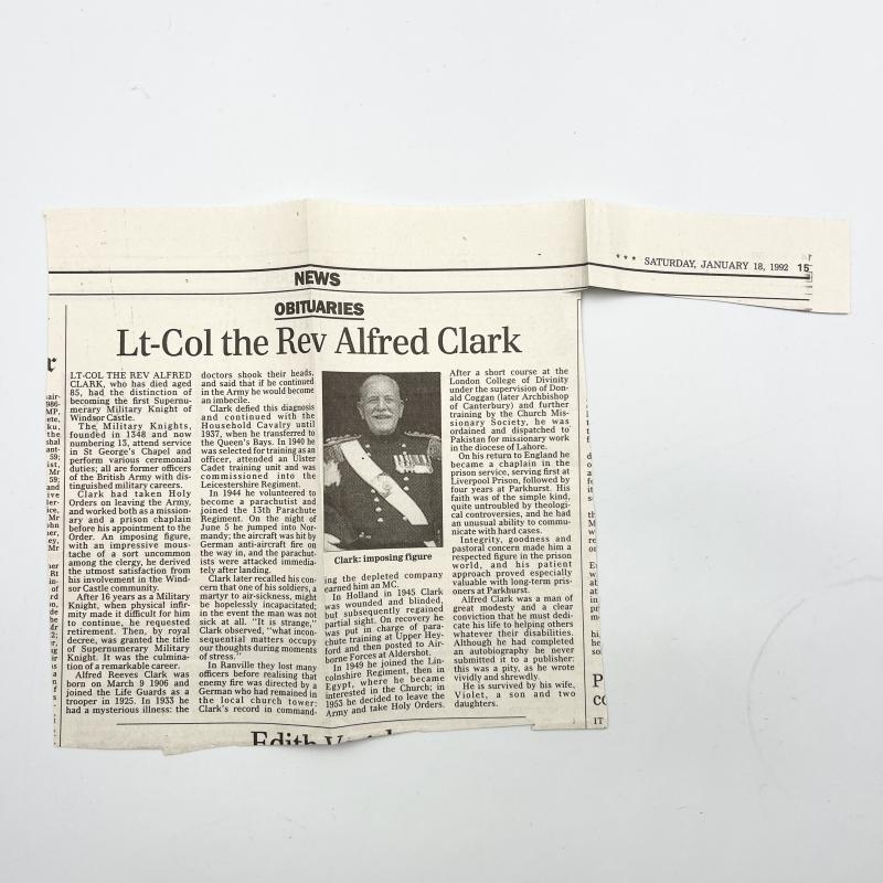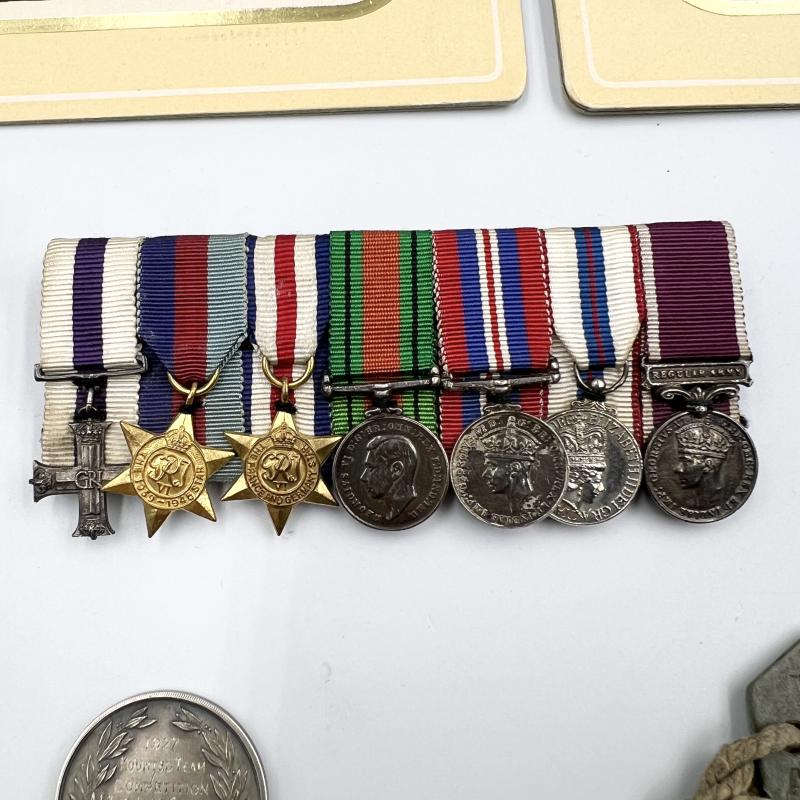 A WWII and later group of miniature medals, awarded to Lt-Colonel the Reverend Alfred Clark, to include a Military Cross, 1939-1945 Star, the France and Germany Star, Defence Medal, 1939-1945 medal, Queen Elizabeth 1977 Jubilee medal and the Regular Army Long Service and Good Conduct Medal, accompanied by WWII fibre dog tags, a photographic negative of Clark as a young soldier, as well as photos of Clark leading a service and standing next to King Charles (then Prince of Wales).